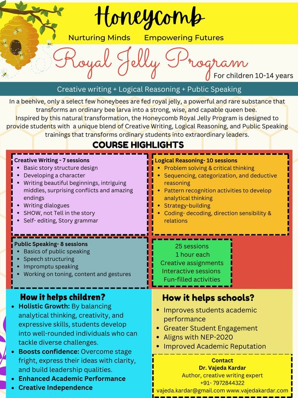 Inspired by this natural transformation, the Honeycomb Royal Jelly Program is designed to provide students with a unique blend of Creative Writing, Logical Reasoning, and Public Speaking trainings that transforms ordinary students into extraordinary leaders.